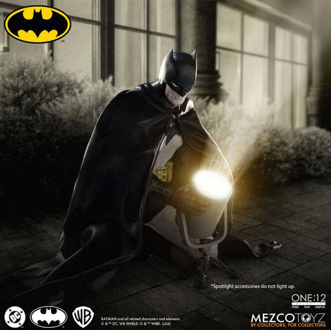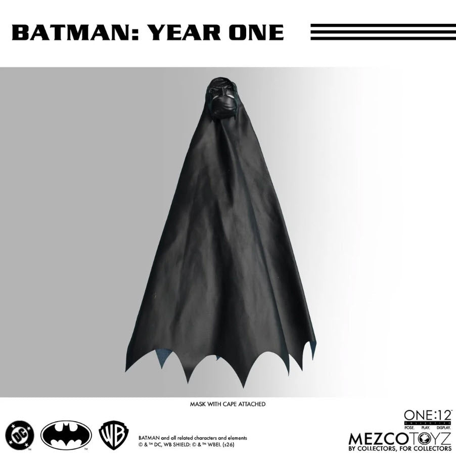 Equipped with an experimental arsenal, Batman comes prepared with batarangs, explosives, a blowgun with dart effect, a recording device, a floodlight, and additional accessories recreating key moments from Year One.