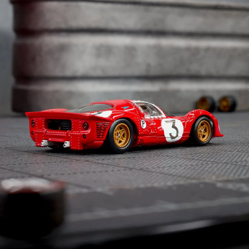 Scuderia Ferrari’s answer to rising challengers in the racing world was the 1967 330 P4, a jaw-dropping rocket that helped Ferrari secure a 1-2-3 podium finish during the first 24-hour endurance race of the year, and another first place soon after. Our Elite 64 casting captures the prancing horse in all its galloping glory, with custom gold-colored Real Riders and the classic aerodynamic curves that made racing history.
