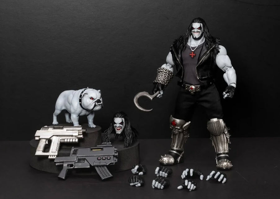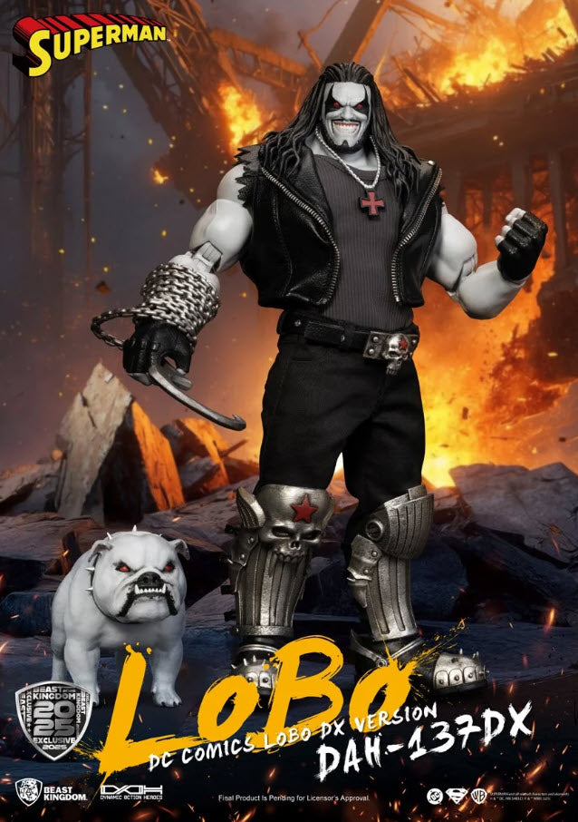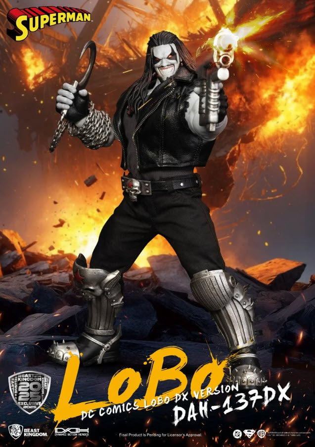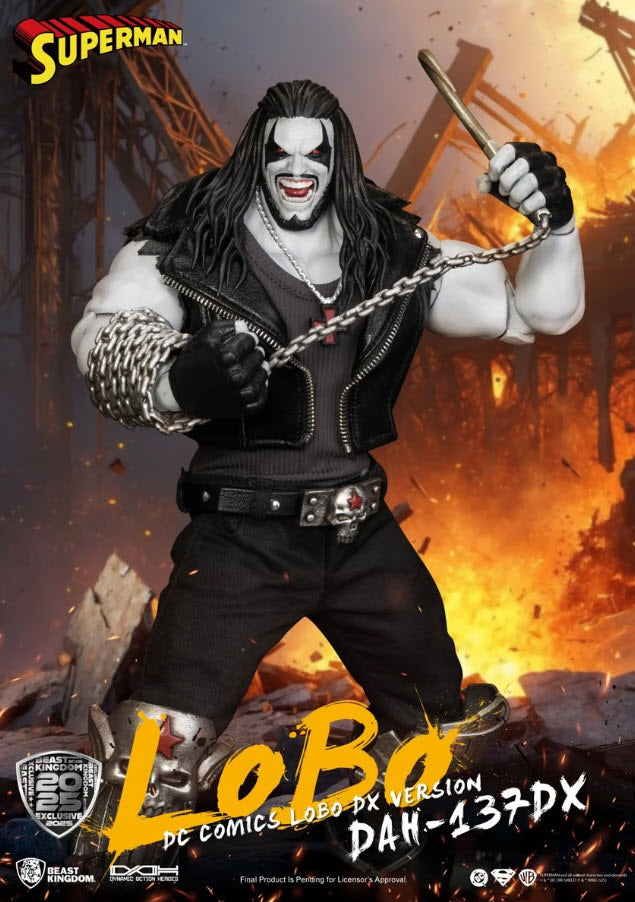 Previews Exclusive! From the depths of Czarnia to the floor of San Diego Comic-Con, the intergalactic badass is back-and bigger, badder, and more brutal than ever. Meet the DC Comics Lobo DAH-137DX Deluxe Action Figure - SDCC 2025 Previews Exclusive! Crafted by Beast Kingdom as part of their Dynamic 8ction Heroes (DAH) line, this 1:9 scale figure blends comic book grit with premium action figure engineering. The DX version amps up the carnage with two head sculpts, interchangeable hands, signature weapons, and complete with his loyal bulldog, Dawg. This figure measures approximately 8-inches tall with approximately 20 points of artiulation. Accessories included are a signature metal-style jacket with real fabric elements, 2x swappable head sculpts (classic snarl & cigar-chomping grin), swappable hands, Lobo's bulldog: Dawg, a hook and chain weapon, signature weapons and more! This figure comes packaged in collector packaging. For ages 15 and up.